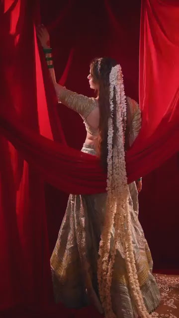 This ice blue kalidar lehenga set, crafted in opulent pure tissue, unfolds with delicate half-moon and diamond-shaped motifs, gracefully filled with blooming contrast florals. Each panel is richly detailed, featuring a dual-toned border in olive bloom and misted blue, accented with intricate V-shaped gota patti and dainty pearl highlights. Paired with a finely embroidered olive bloom blouse, the ensemble is completed by a shimmering tissue dupatta adorned with luminous gota textures, soft sequin glimmers, and broad borders edged in ornate gota lace - evoking timeless elegance with a modern soul.