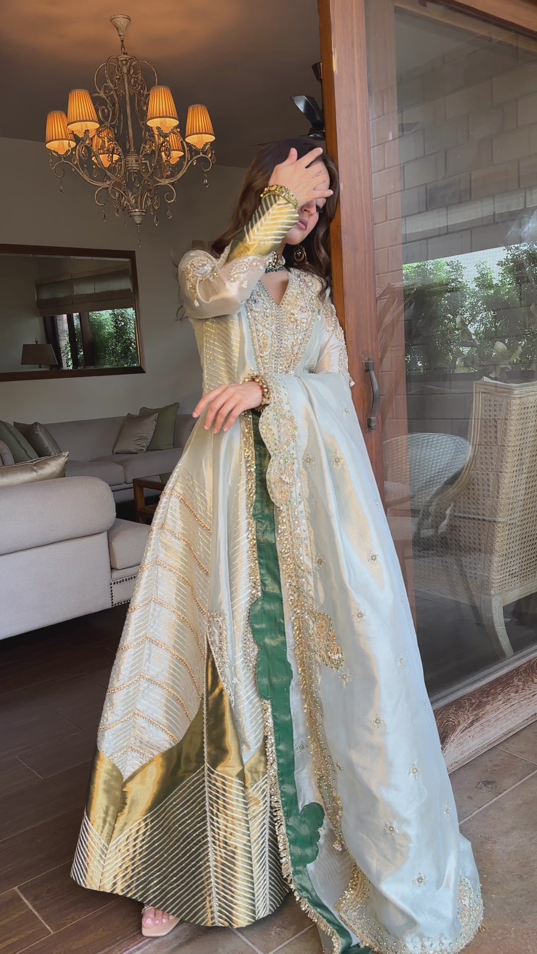 This Kalidar Anarkali set in pearl gold silk zari tissue and Jacquard silk Banarasi features Jharokha-inspired panels with gota texturing and elongated paisley embroidery in zari and zardozi. The ensemble is completed with a pearl gold tissue dupatta, adorned with Jharokha-inspired panels and pearl detailing.